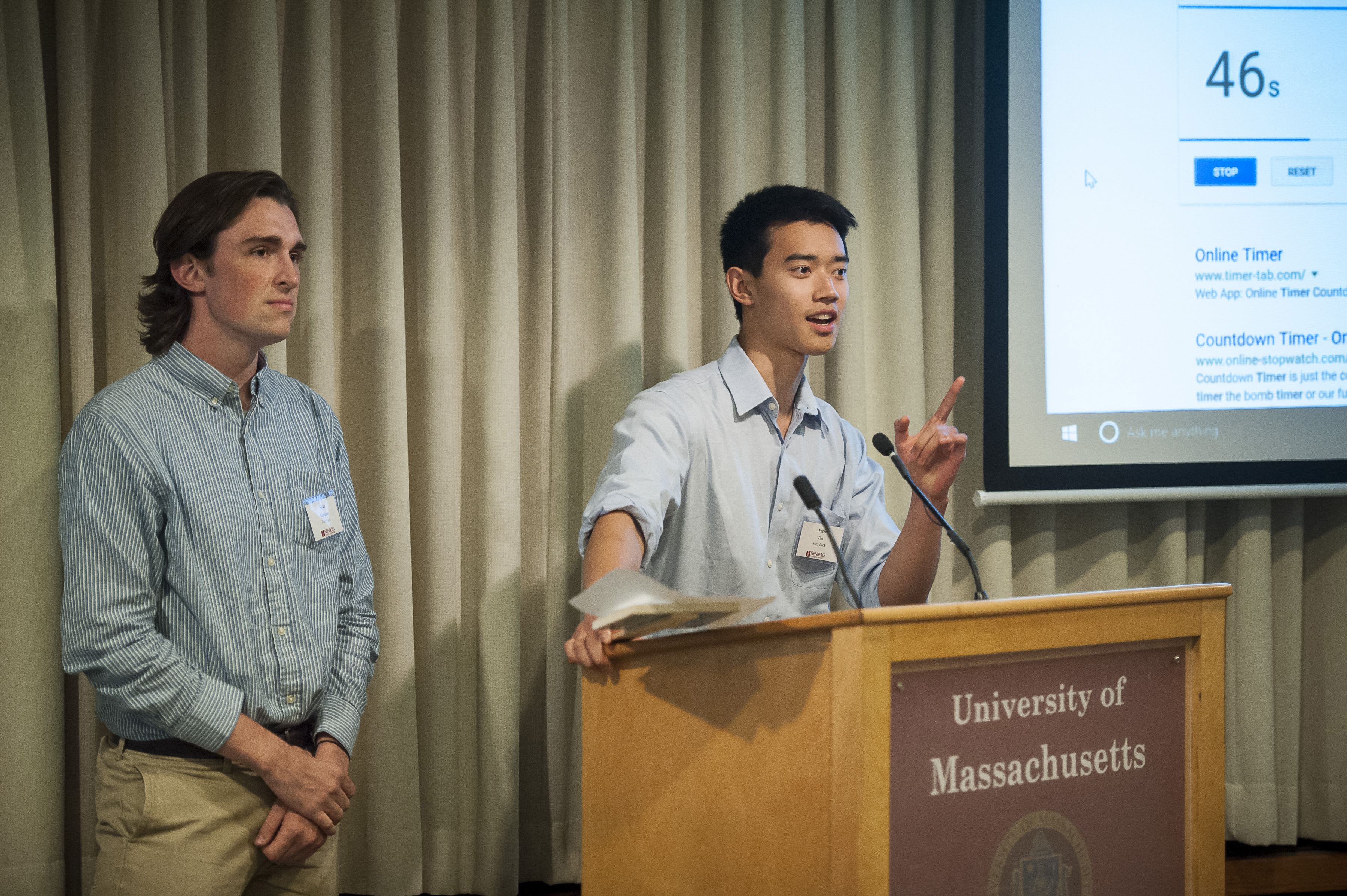 Hosted by the Berthiaume Center for Entrepreneurship, the four-part Innovation Challenged kicked off with The Minute Pitch on Wednesday, Oct. 25. In front of an audience of nearly 200 students, faculty, staff and supporters, 22 teams gave 60-second pitches of their venture idea. With assistance from the sponsors, EY and Bud Robertson (Isenberg ’72), $2,500 is prize money was awarded to the first-, second- and third-place teams and the audience choice selection.