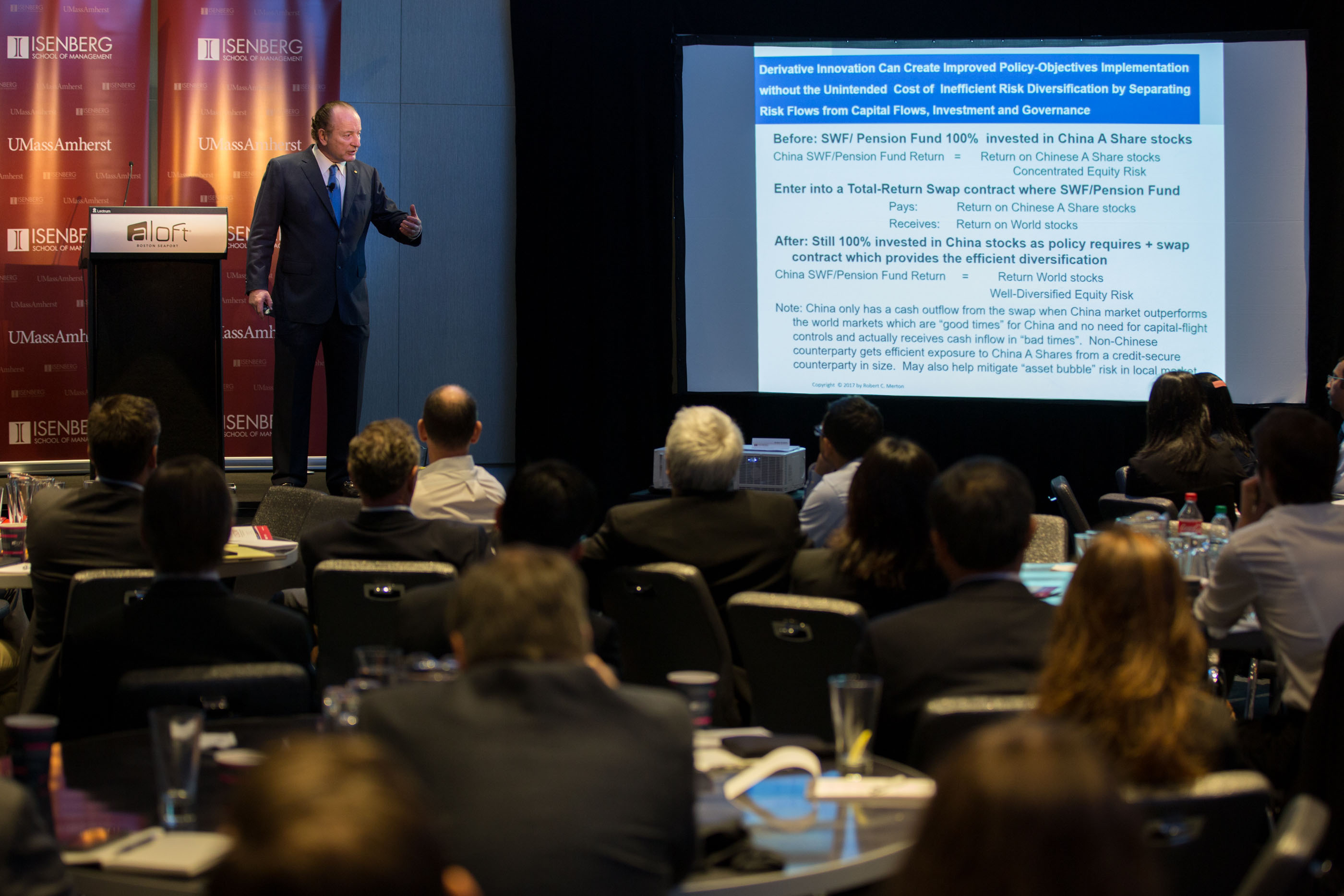 Since the 1970s, innovation—conceptual and technological—has transformed the practice of finance. But “innovation itself doesn’t create growth” . . . it must be “translated into the general economy,” insisted MIT finance professor Robert C. Merton in his keynote presentation at Isenberg’s Center for International Securities and Derivatives Markets’ (CISDM) annual research conference on October 6. Professor Merton—a 1997 recipient of the Nobel Prize in Economics—headlined an ambitious program devoted to diverse aspects of digitally enabled financial innovation, including cryptocurrencies, algorithmic trading, and other advances on the financial landscape. Attended by a packed house of 125 academics and practitioners, the daylong event took place at Boston’s Aloft Boston Seaport Hotel.